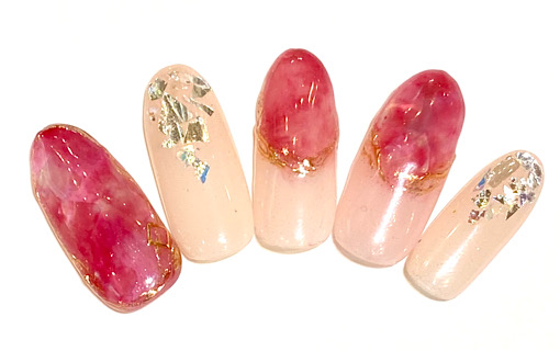 赤とピンクのマーブルの中に埋め込まれたシェルが