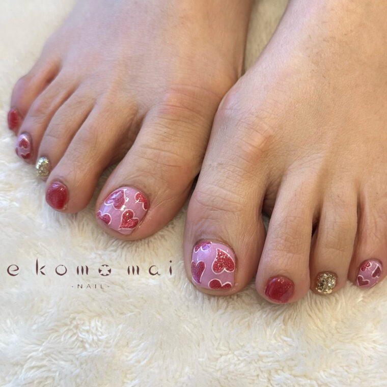 Name ハートネイル/フットネイル Data カラーピンク/レッド/ホワイト/ゴールド アート手書きアート/ミラー Point バレンタインシーズンにぴったりなハートネイル♪ ハートの部分もマグネットになっているので 角度によってキラキラ光って可愛いです♪ 担当スタイリスト