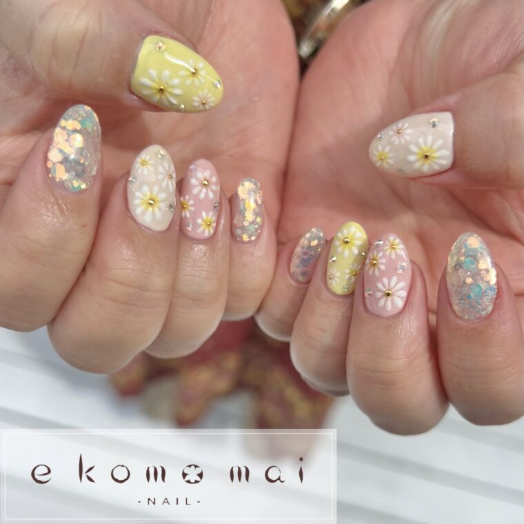 Name フラワーネイル Data カラーイエロー/ブルー/ピンク/ホワイト アートラメがけ/手描き Point ぷっくり小花ネイル☆ パステルな春らしいカラーに ぷっくり浮き出た 小花が可愛らしいデザインです♪ ラメは蓄光ラメになっているので 夜に光りますよ♪ 担当スタイリスト JNA認定講師 代表 宗像 かつら お客様の美しさを引き出すお手伝いをさせていただきたく 一人一人に合った、カウンセリングを大切にしています。 「e komo mai」では、ラ...