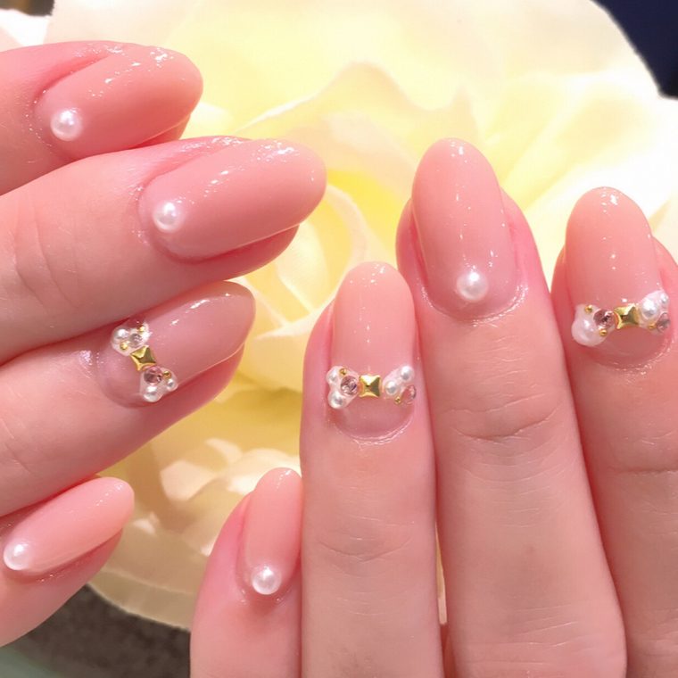 大人気の新色ベージュを使いました。さりげないラメと、パールのリボンが素敵なお上品ネイル。