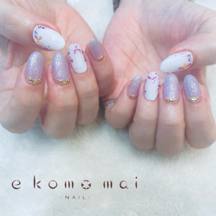 Name フラワーシェルネイル Data カラーパープル/ホワイト アートシェル/スタッズ/マグネット Point 何色かシェルを使ったフラワーをデザイン またパープルのマグネットで お手元が輝きに華やかになりますね♪ 担当スタイリスト