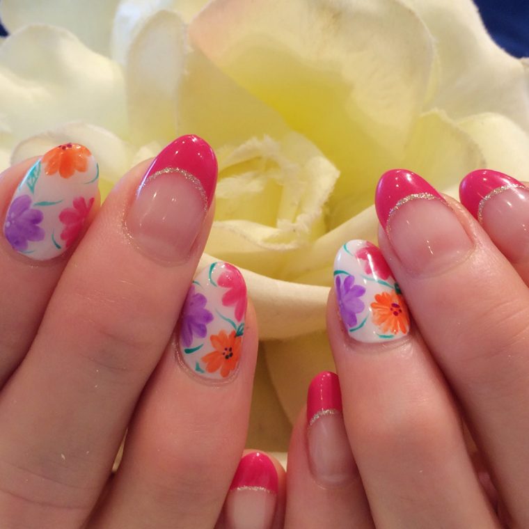 白ベースに明るいカラーの手描きフラワーが可愛いネイルピンクで女子力もアップしますね。